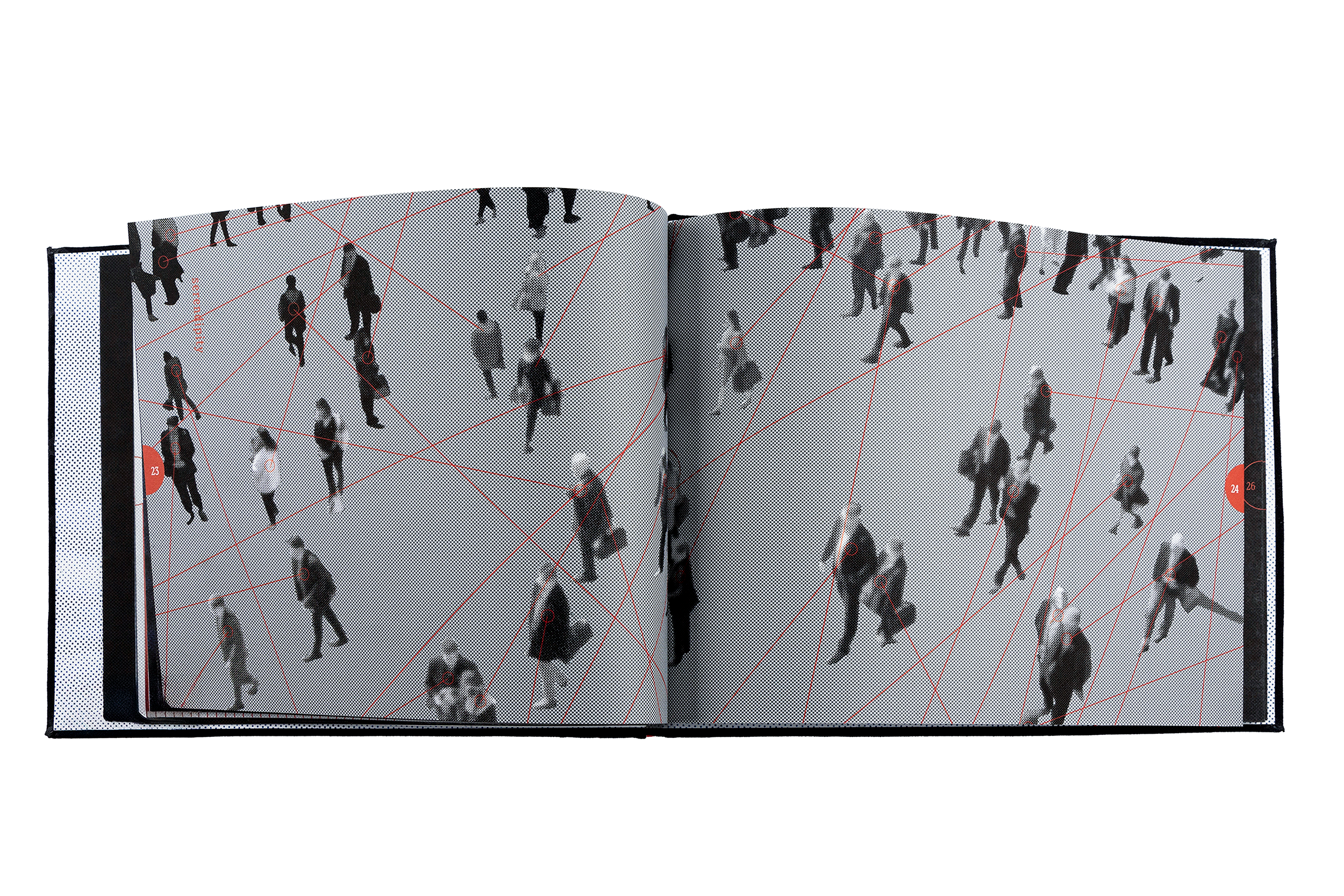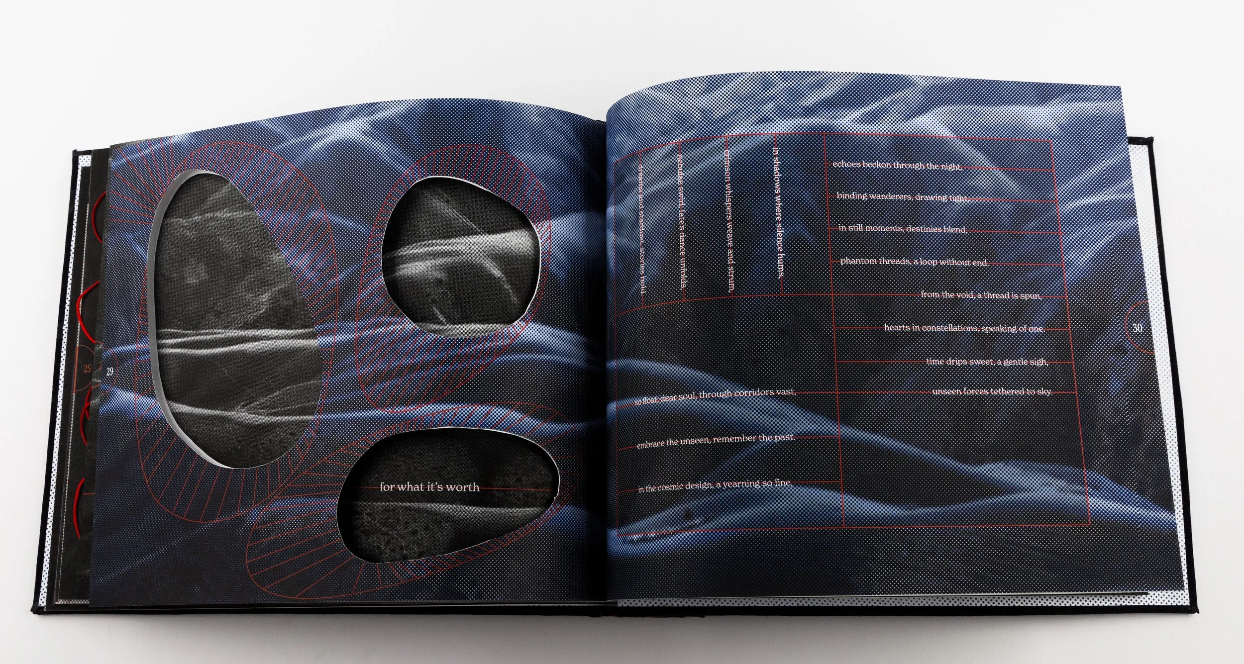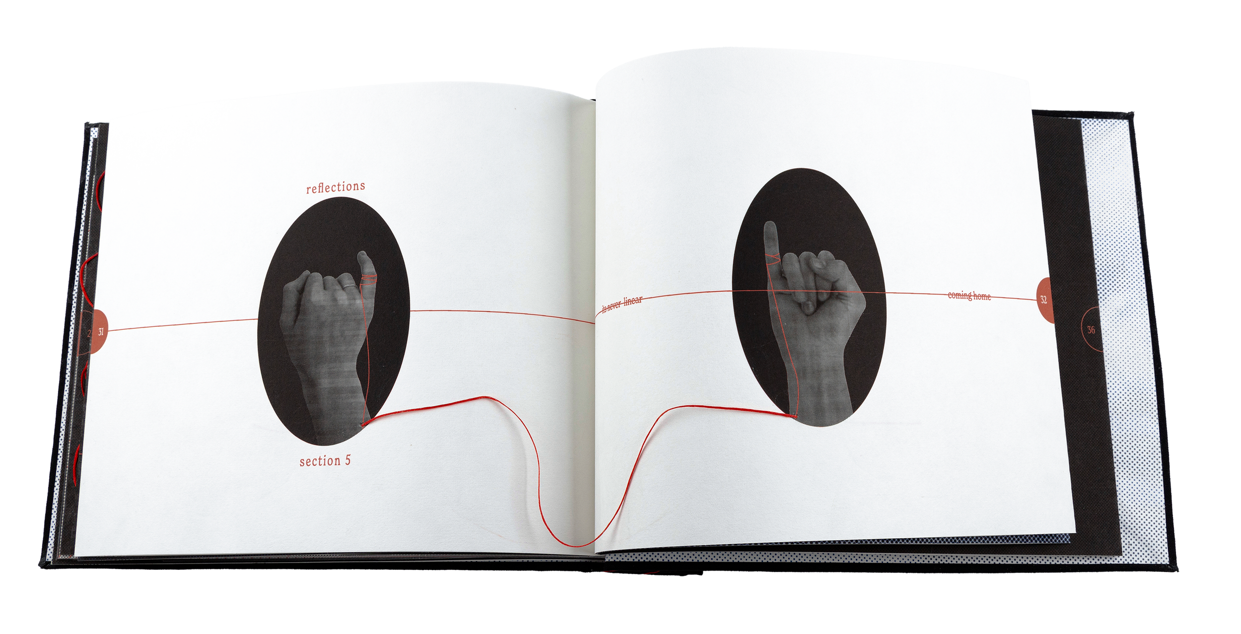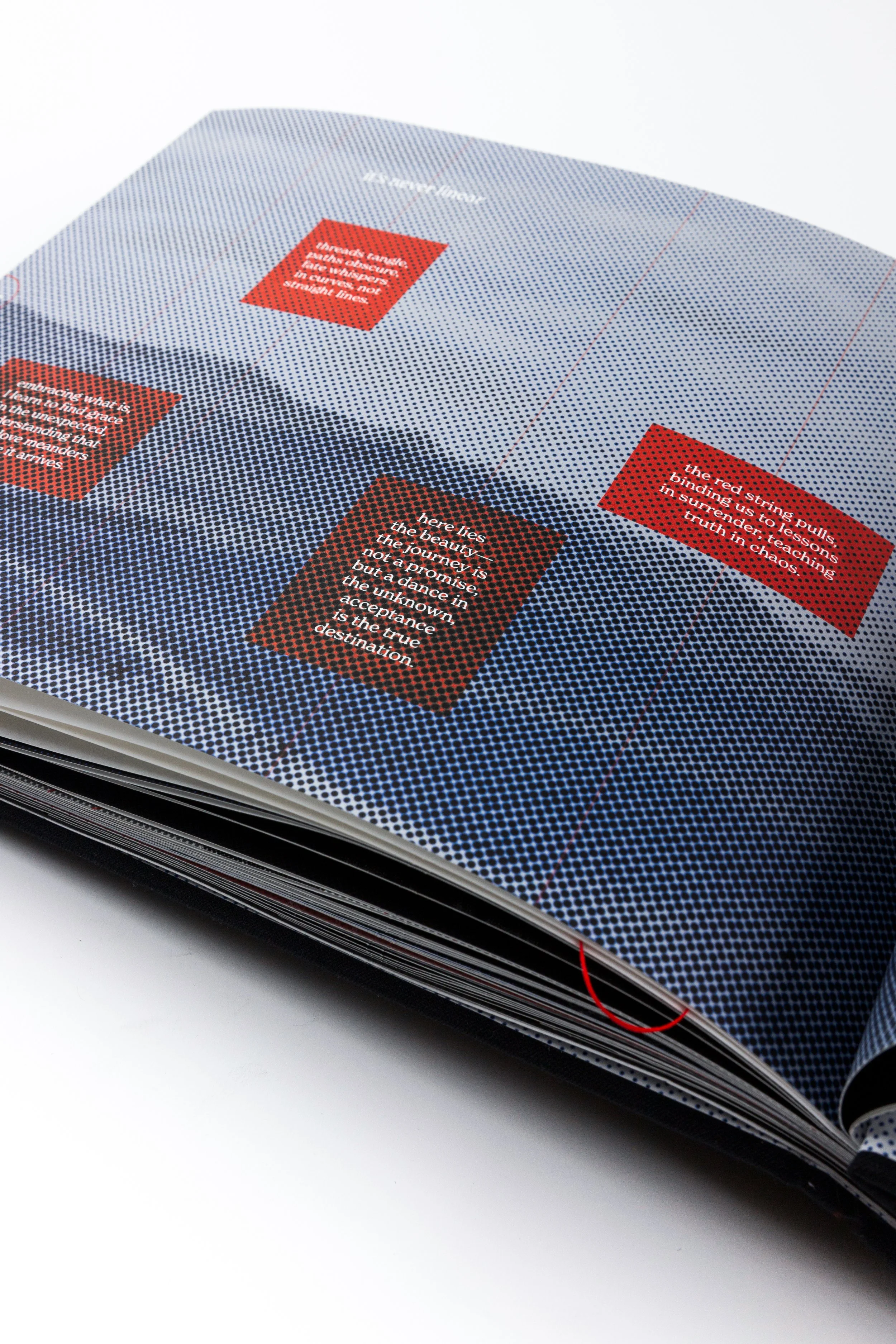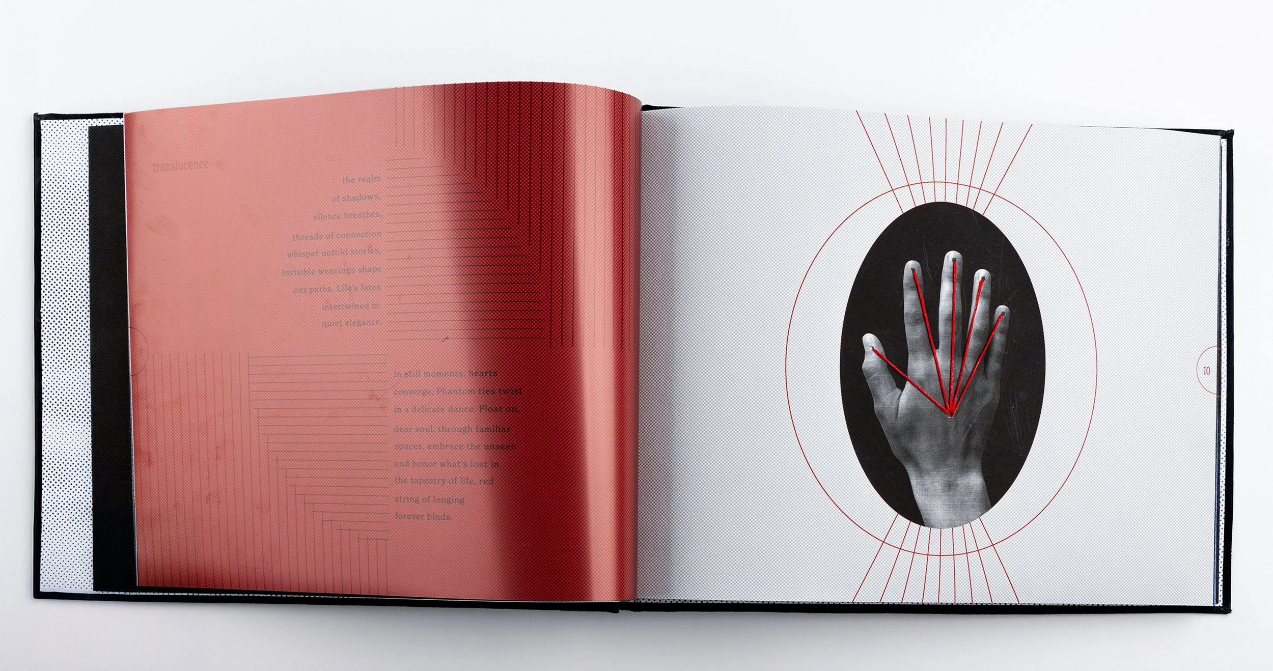 This section deals with the idea that you can walk past a destined connection without noticing. Die cuts, physical string, and a grid-based layout create a non-direct reading path that still makes sense from any starting point. One spread only reads correctly when the book is fully open, which controls how it can be viewed.