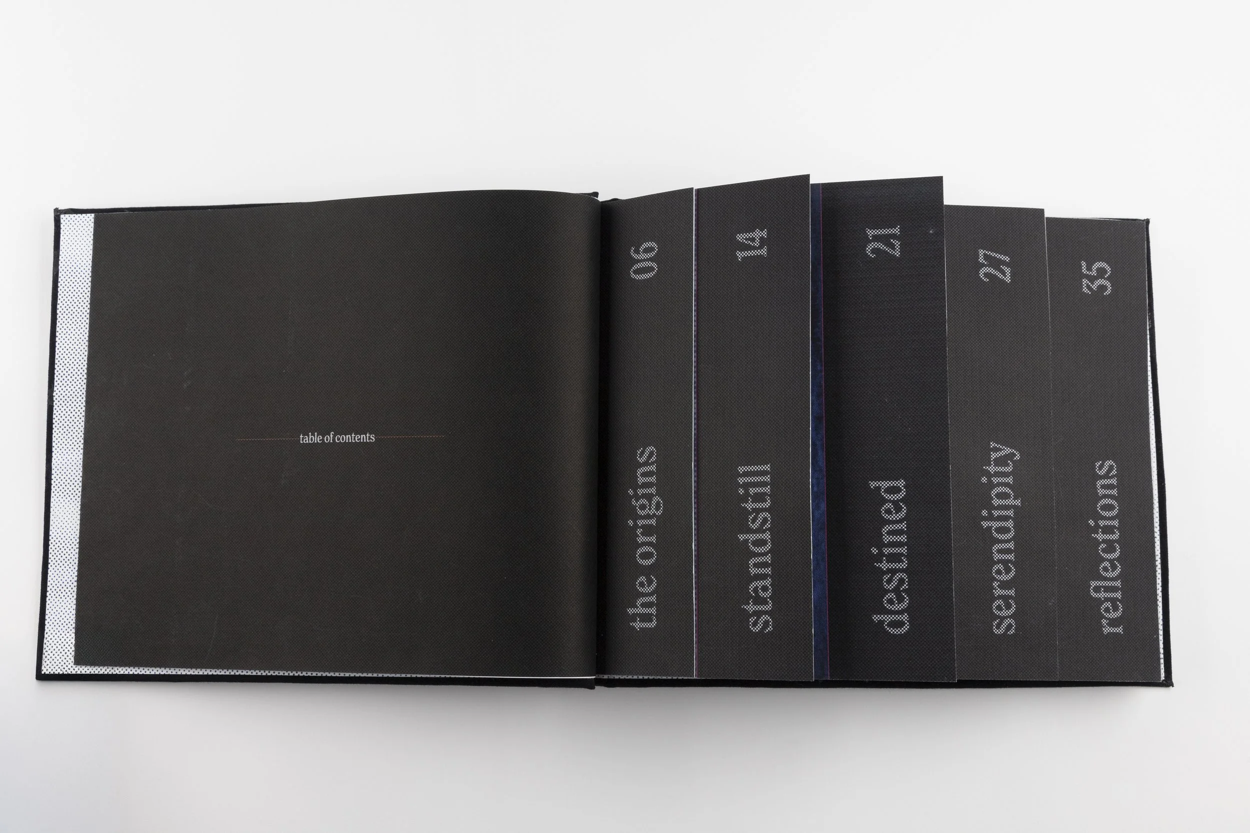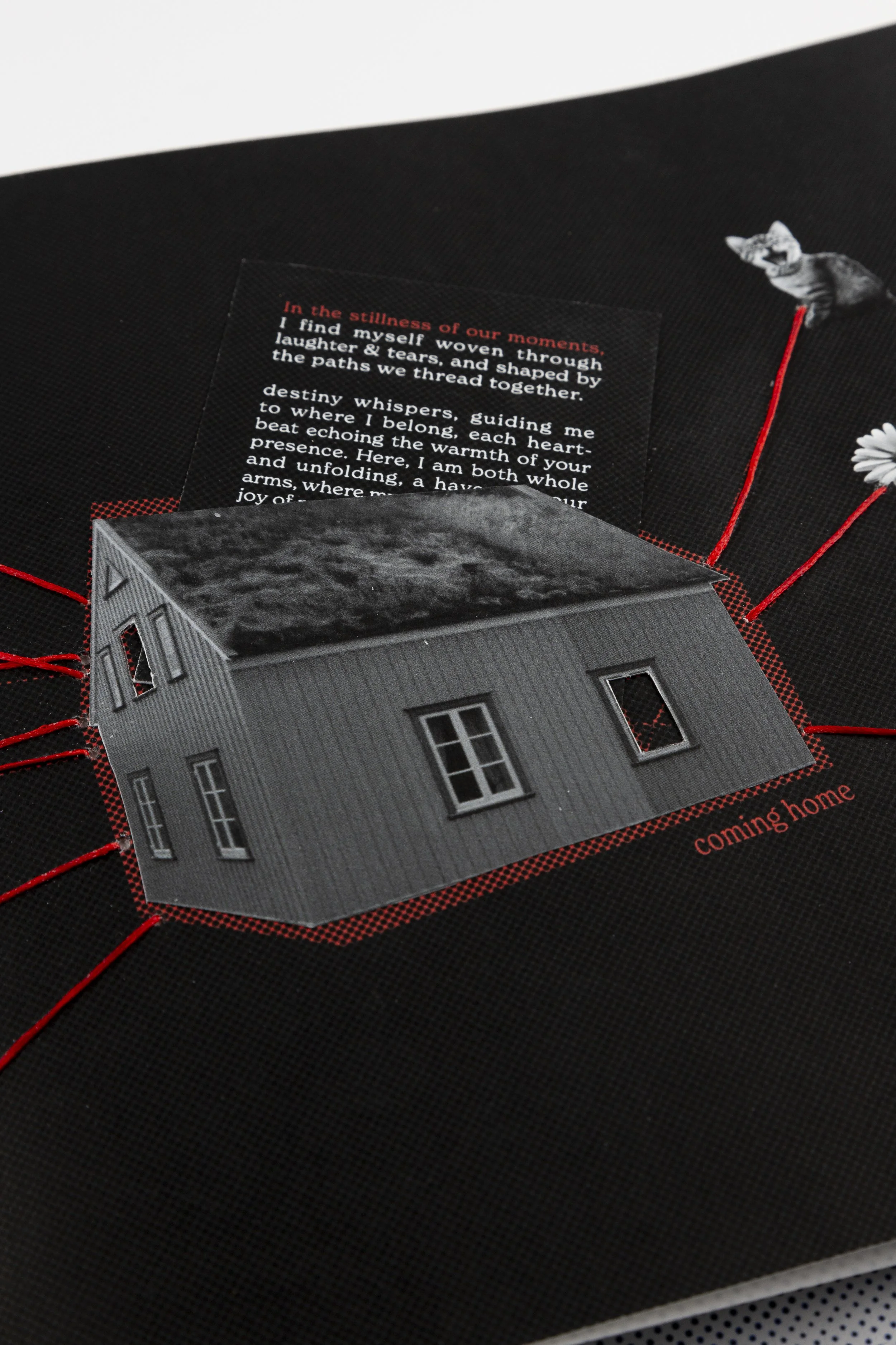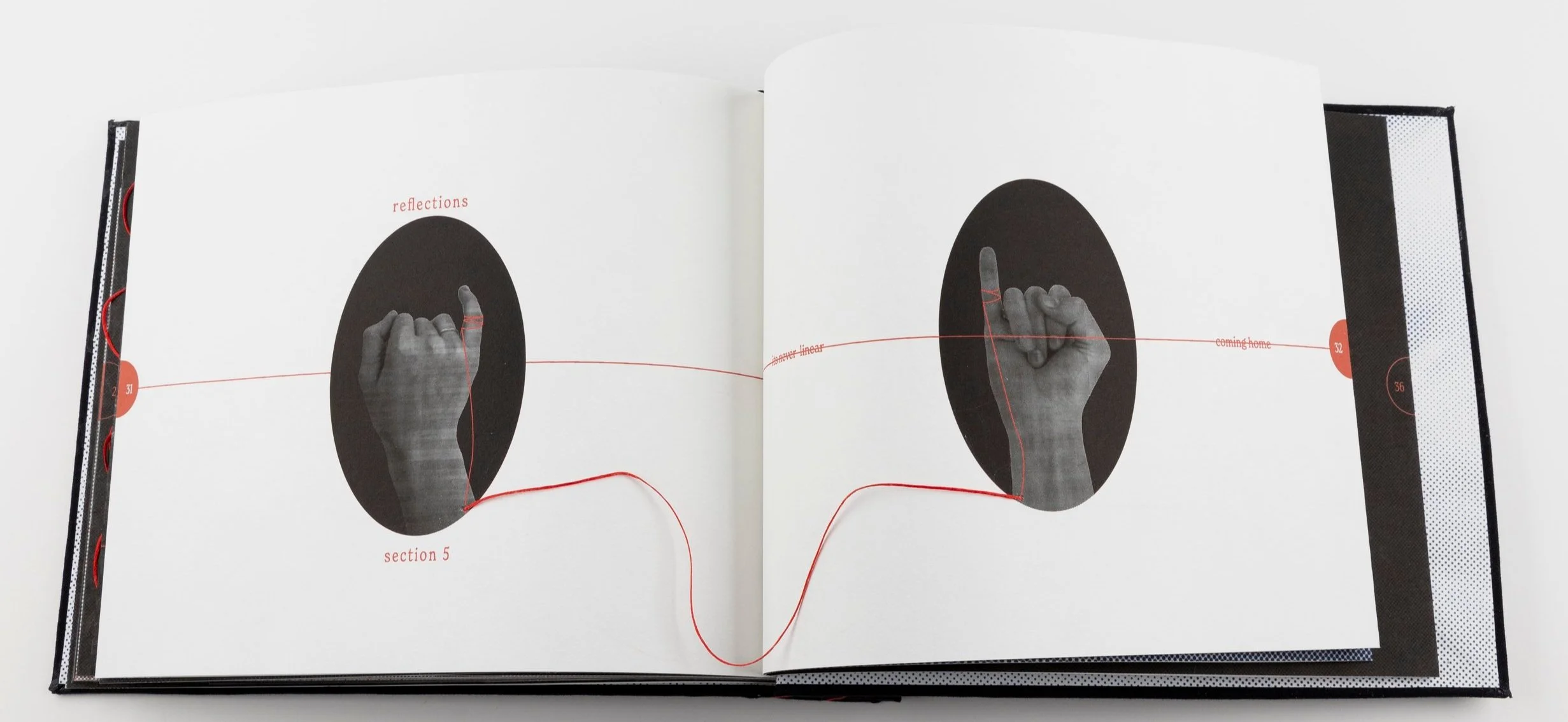 The red string winds through the book, physically connecting pages and ideas, while acetate and vellum layers reveal hidden fragments beneath the surface—mirroring the complexity of human connection. A tabbed table of contents guides the experience, creating a sense of order within the chaos of fate. The letter section, filled with intimate love letters, reflects the vulnerability of opening yourself to another.
