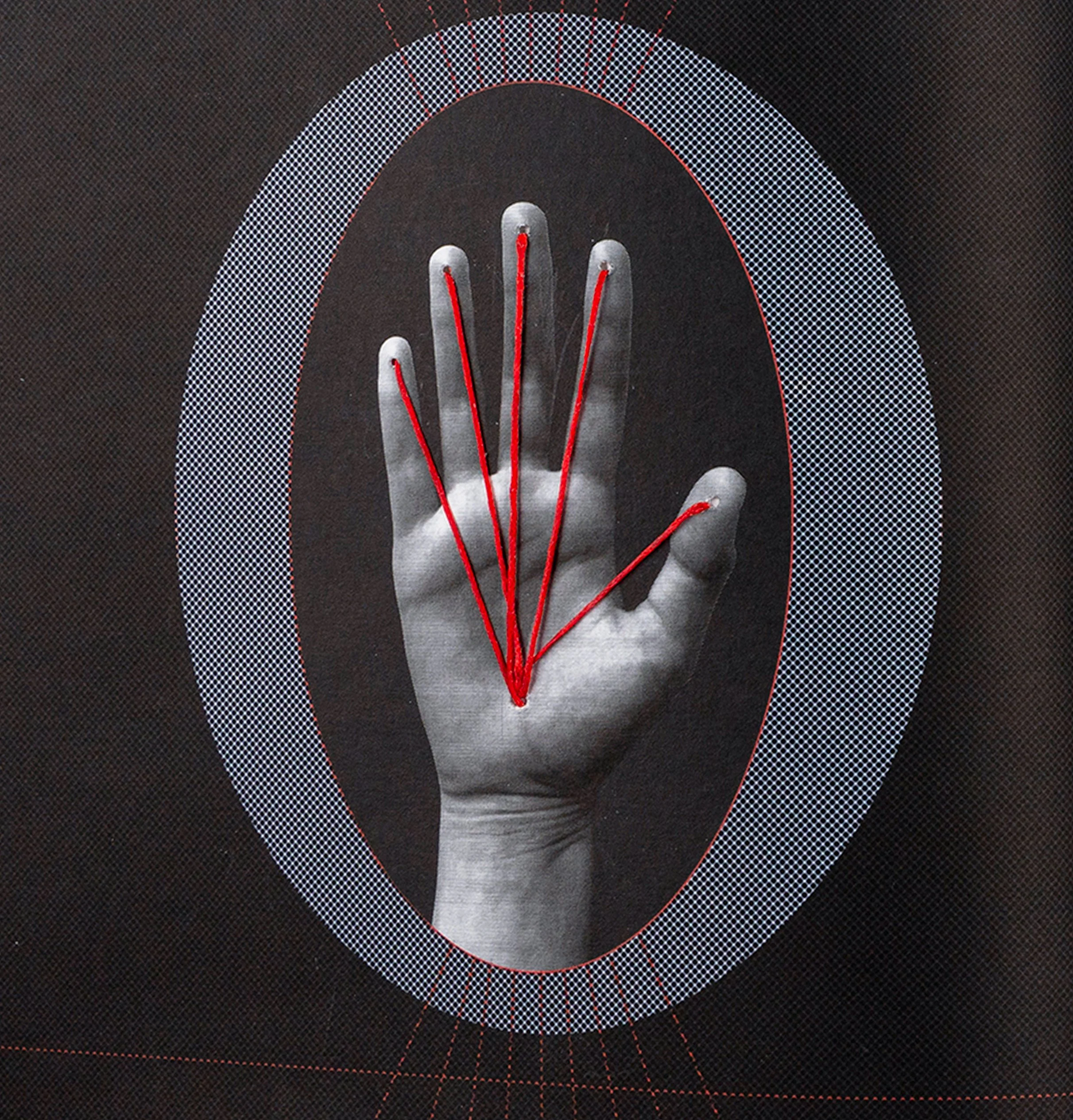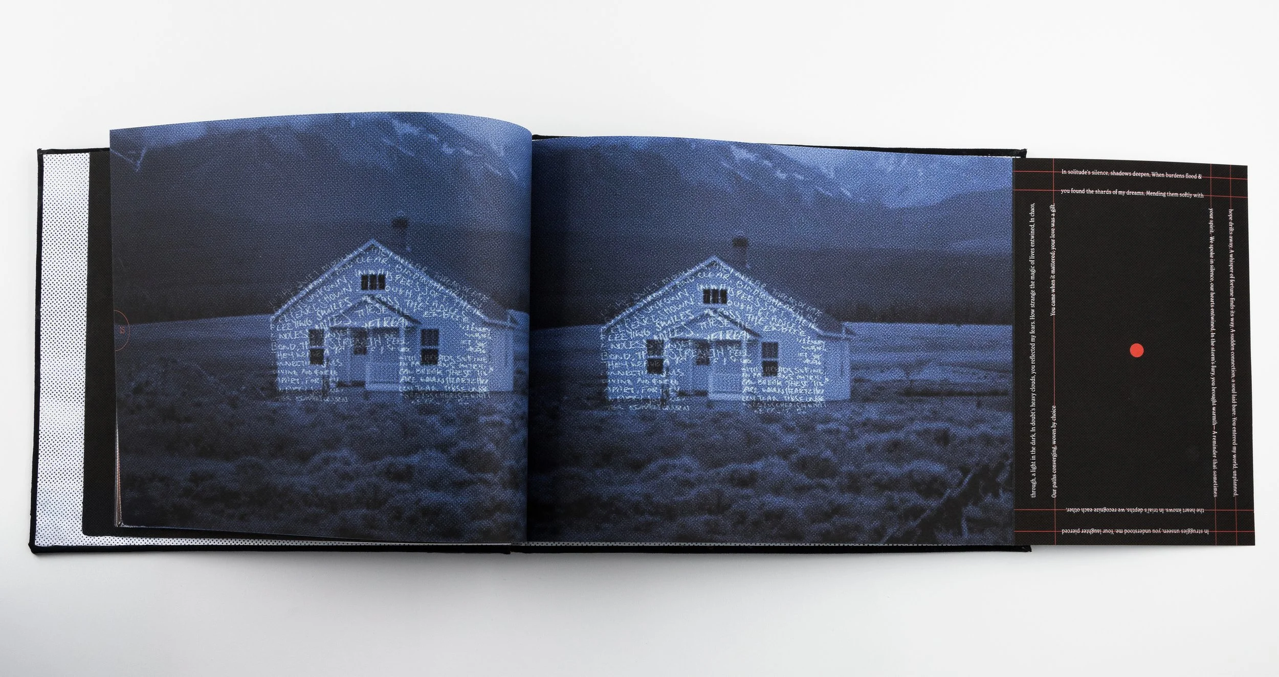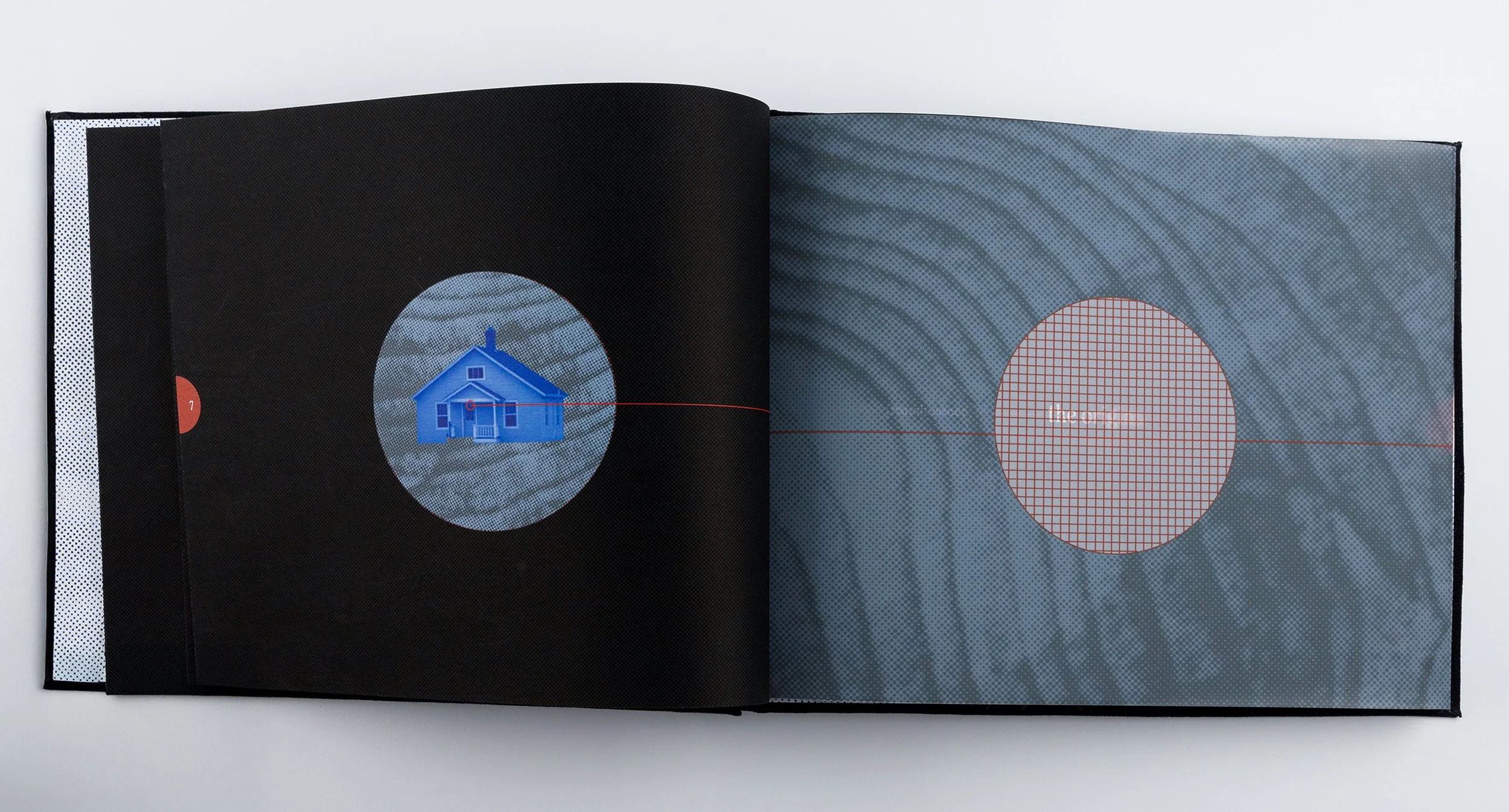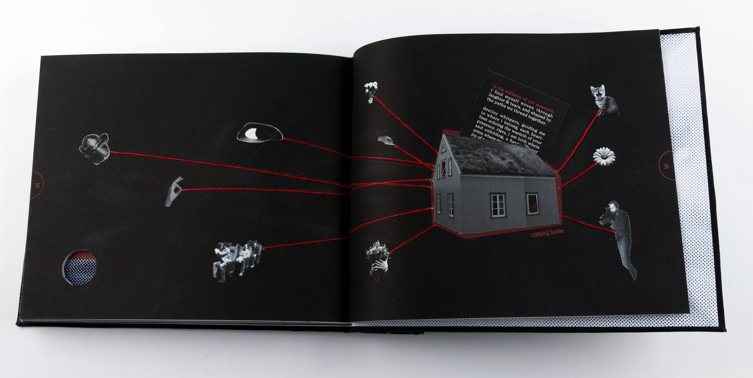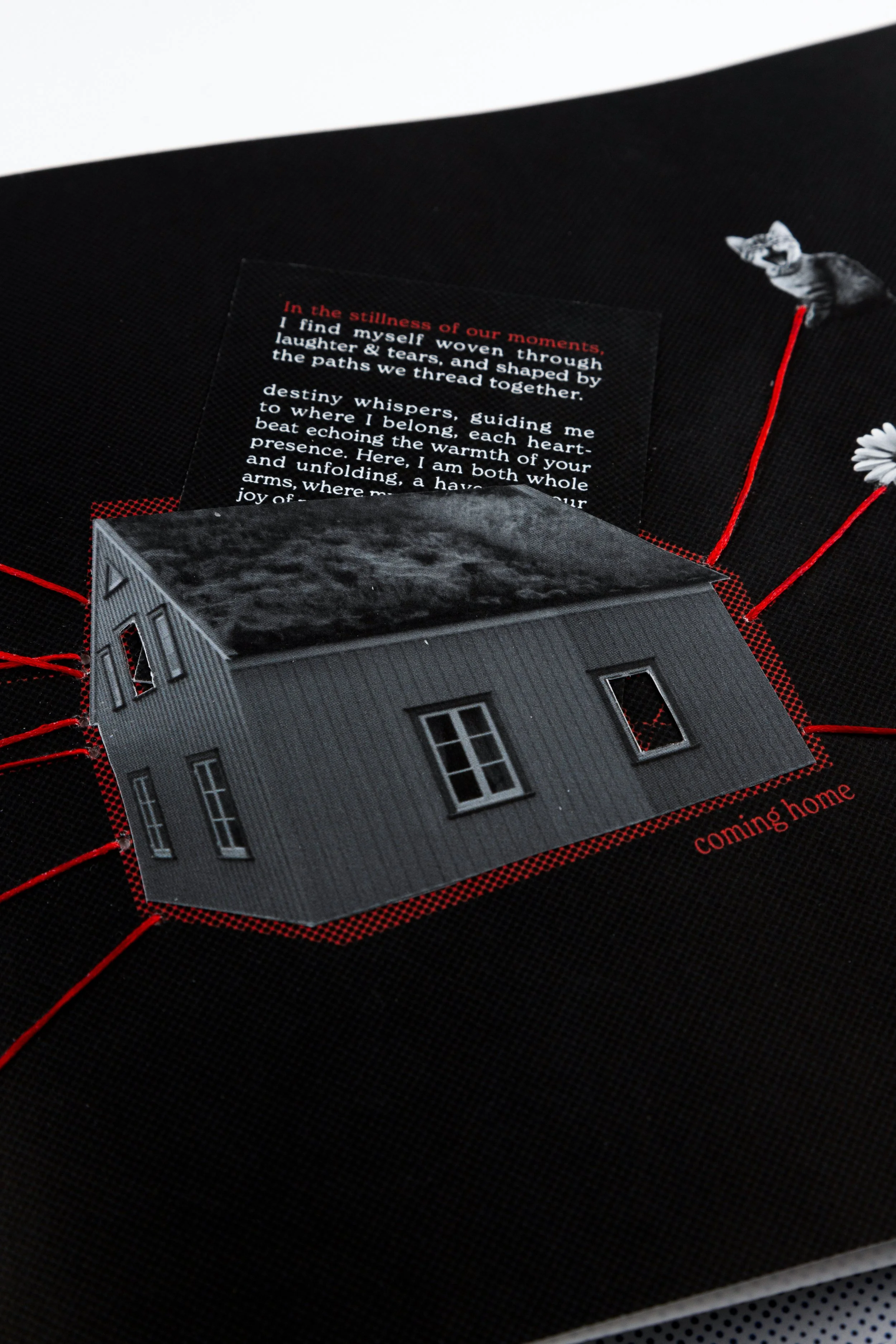 This section is where the thread is resolved physically. The hands are connected by the string, and the composition stays non-linear to reinforce that the experience is not straightforward. A die cut and contrast shift guide into the final dark spread, where the string leads to the house and the last poem is tucked behind it to be pulled out and read.