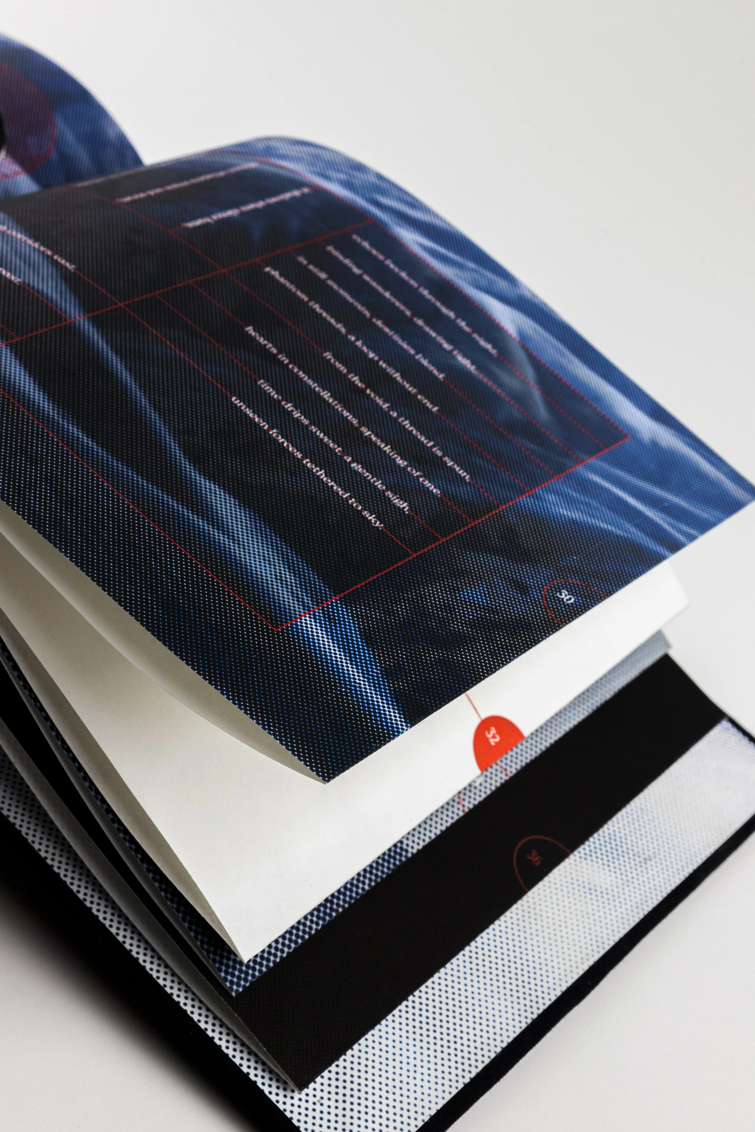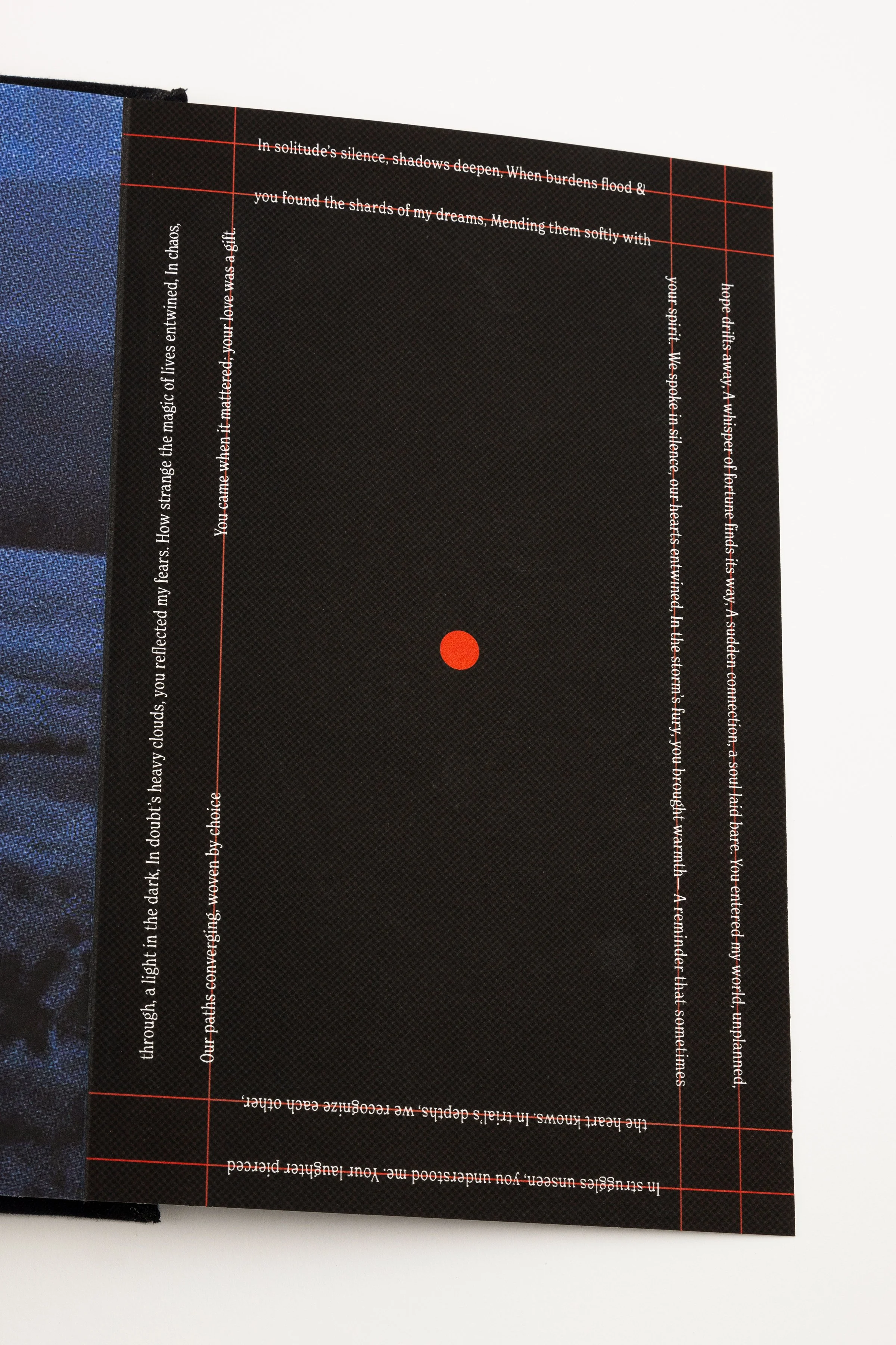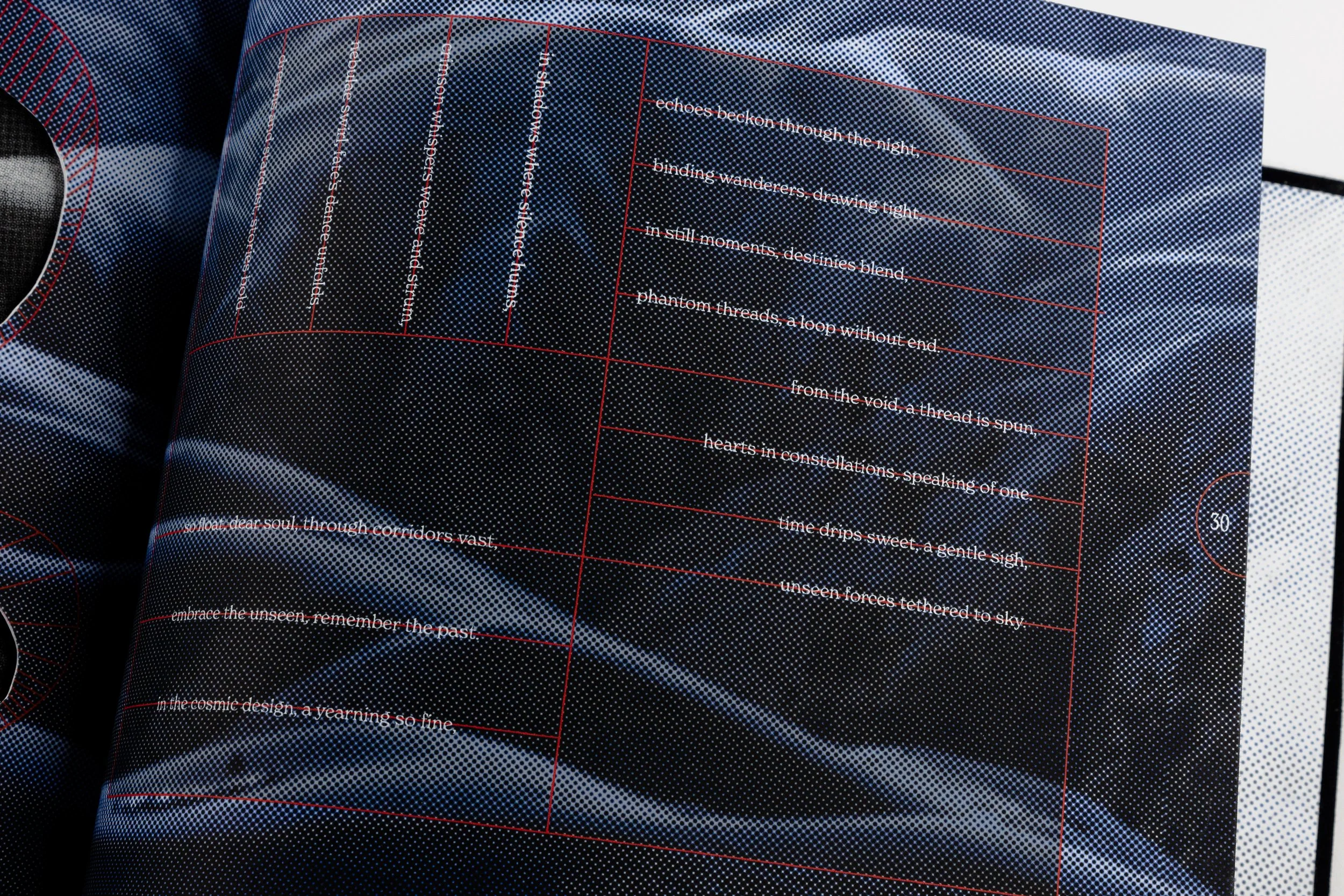 When a connection starts to feel fated, this section holds the hesitation. Blue photography carries the stillness, with minimal type and negative space to slow the read. A half sheet delays the poem so the reveal happens on the turn.