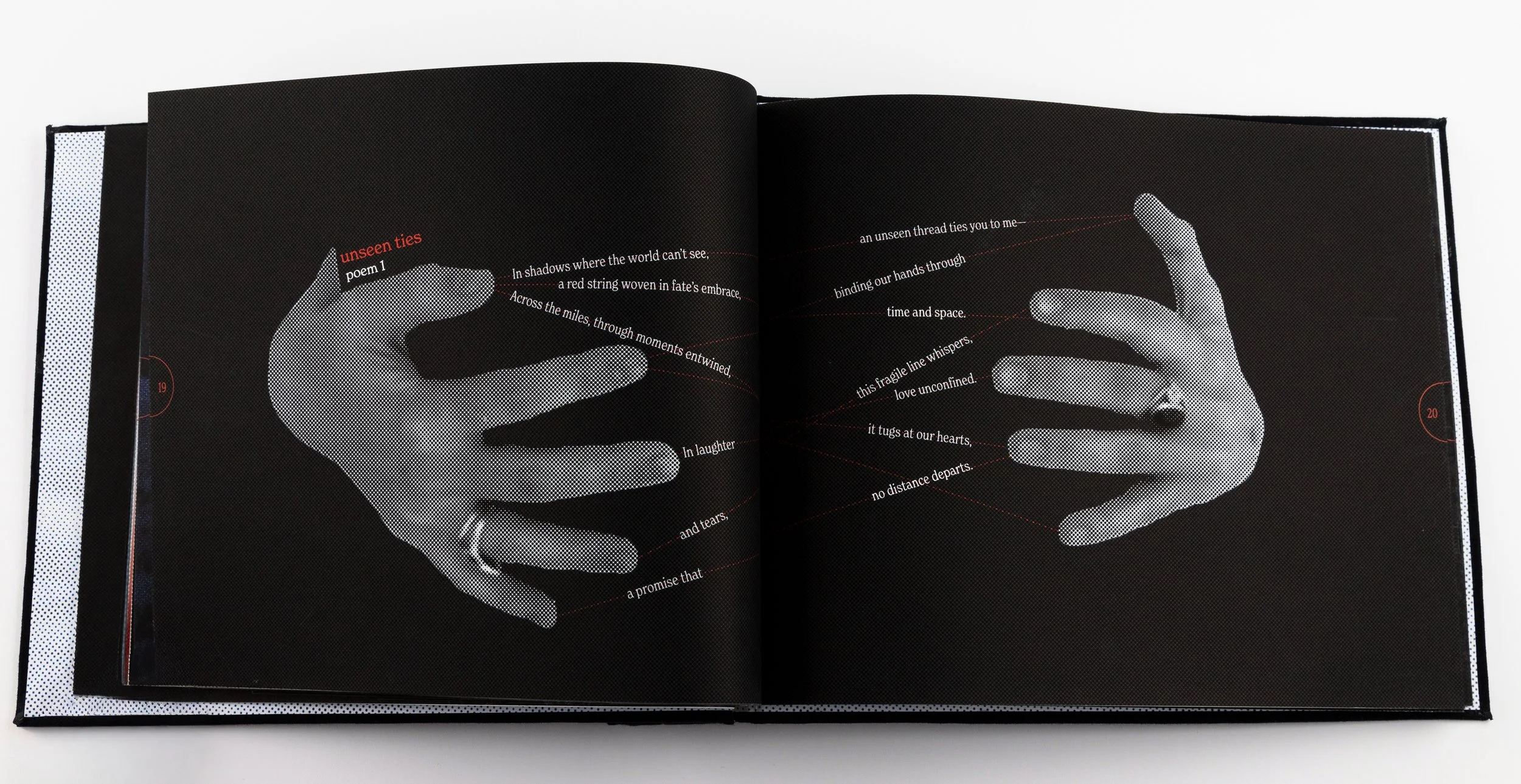 As the possibility of fate starts to feel real, this section leans into acceptance. “Letter to You” is presented as a physical letter insert, and the string shifts into a digital form through the hands and image. The poem is set in a less linear layout to move the reader between typography and photography.
