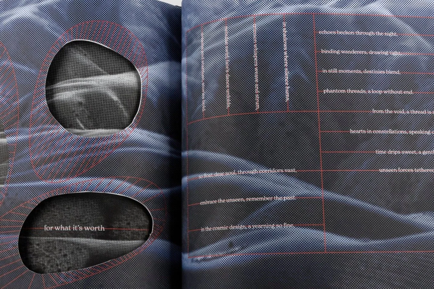 Entwined is an interactive poetry collection that explores the Red String of Fate. Through purposeful design choices, the book physically weaves this invisible thread into reality, using an actual red string integrated throughout its pages. Each section mirrors the emotions one may feel when experiencing a fated connection, whether platonic or romantic. From the pull of longing to the tension of distance, the book’s layout, interactivity, photography, and image treatments work together to create a tactile experience of connection and destiny.