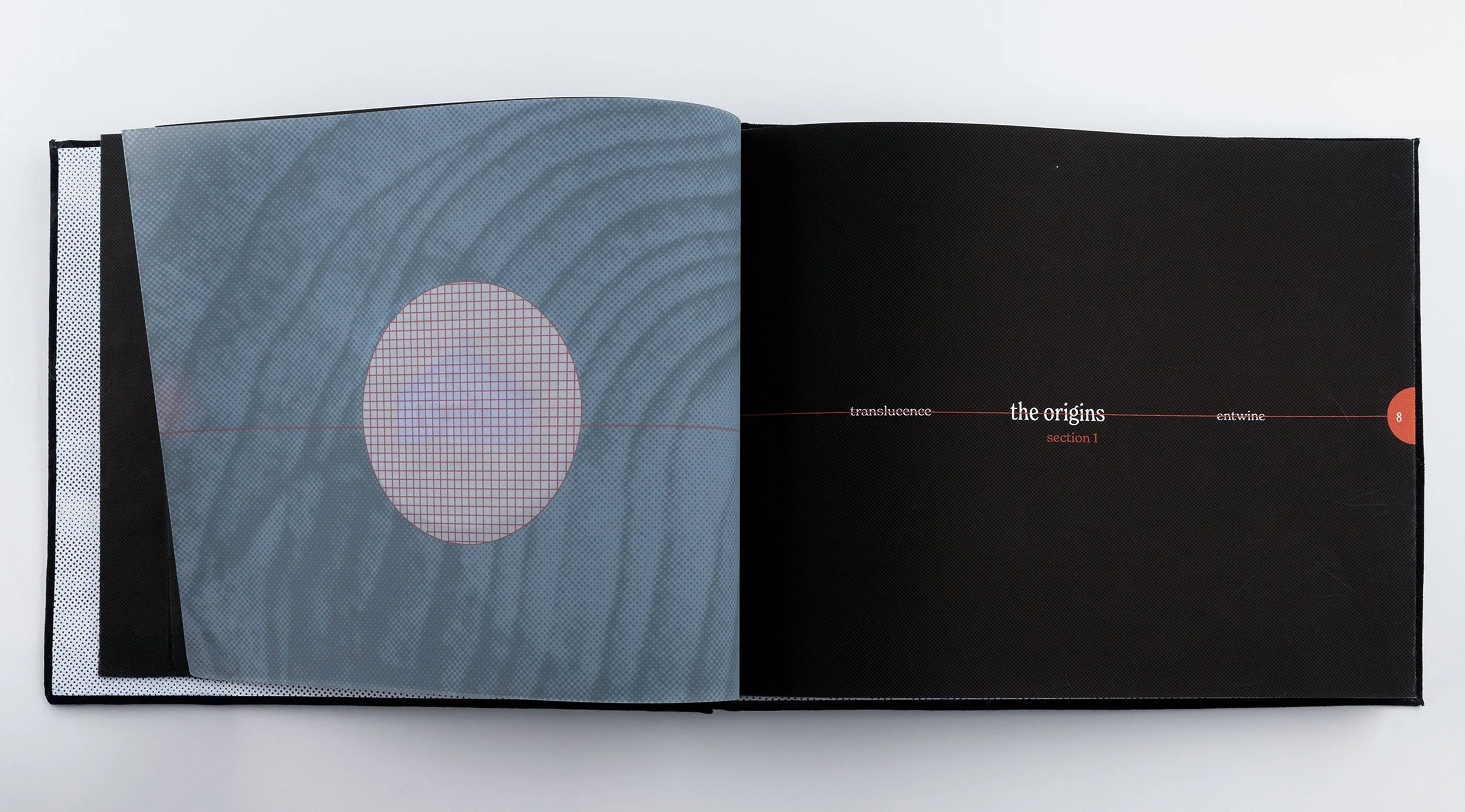 Entwined is a single prototype built around one constraint: making the red string function through the entire sequence. I developed the layout digitally, adjusted the construction when certain moves could not be built, then printed on Japanese washi and finished the book by hand with French folds, layered vellum and acetate, drilled holes, and a Japanese stab bind in red waxed linen.