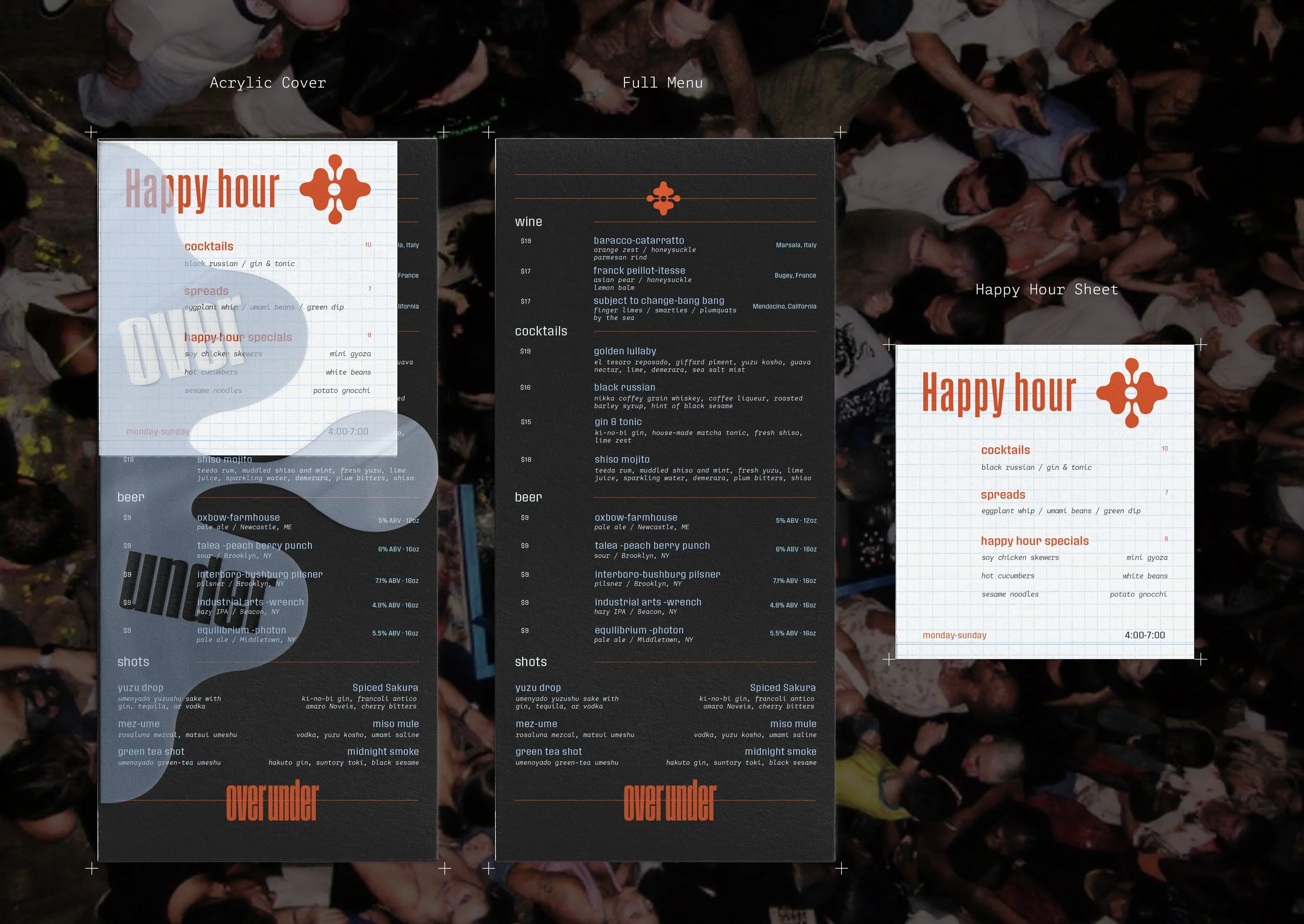 Under in Over/Under is the listening room on the ground level, open to both guests and the public. It uses warm colors, tactile materials, motion, and layered compositions to create a space for connection while remaining cohesive with the overall brand identity. Orange defines the space and builds contrast with the calm tone of Over.